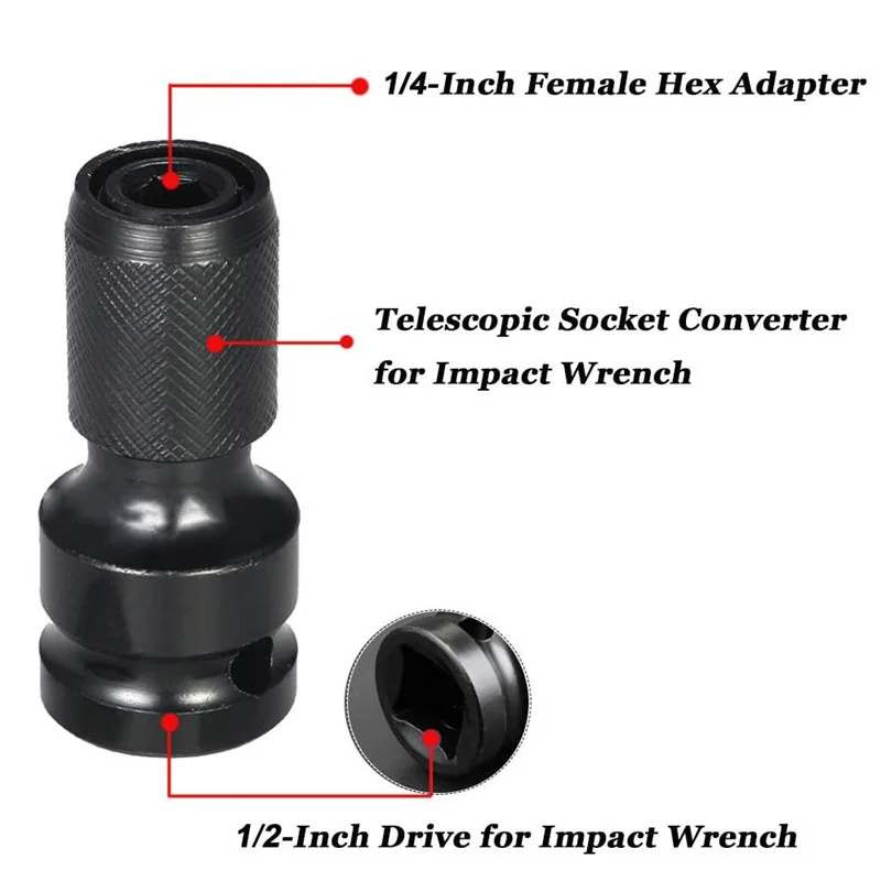 1. The wrench socket adapter can convert a 1/2-inch impact wrench into a 1/4-inch hexagonal handle quick loading bit system, convert an air or power impact wrench into a drill bit and a ratchet wrench into a screwdriver.